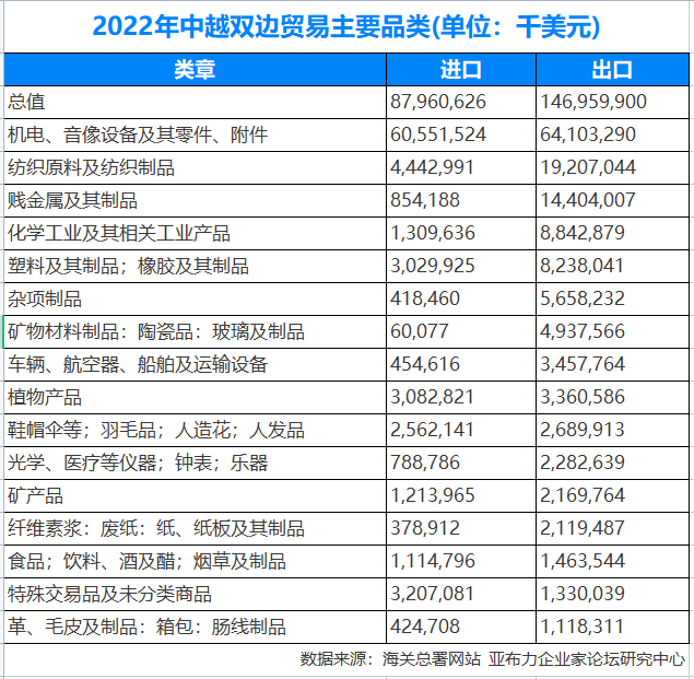 2022年,中越双边贸易创造了新的历史纪录,中国与越南贸易额达到2349.2亿美元,同比增长2.1%,中国向越南出口1469.6亿美元,同比增长6.8%,中国从越南进口879.6亿美元,同比下跌4.7%。
